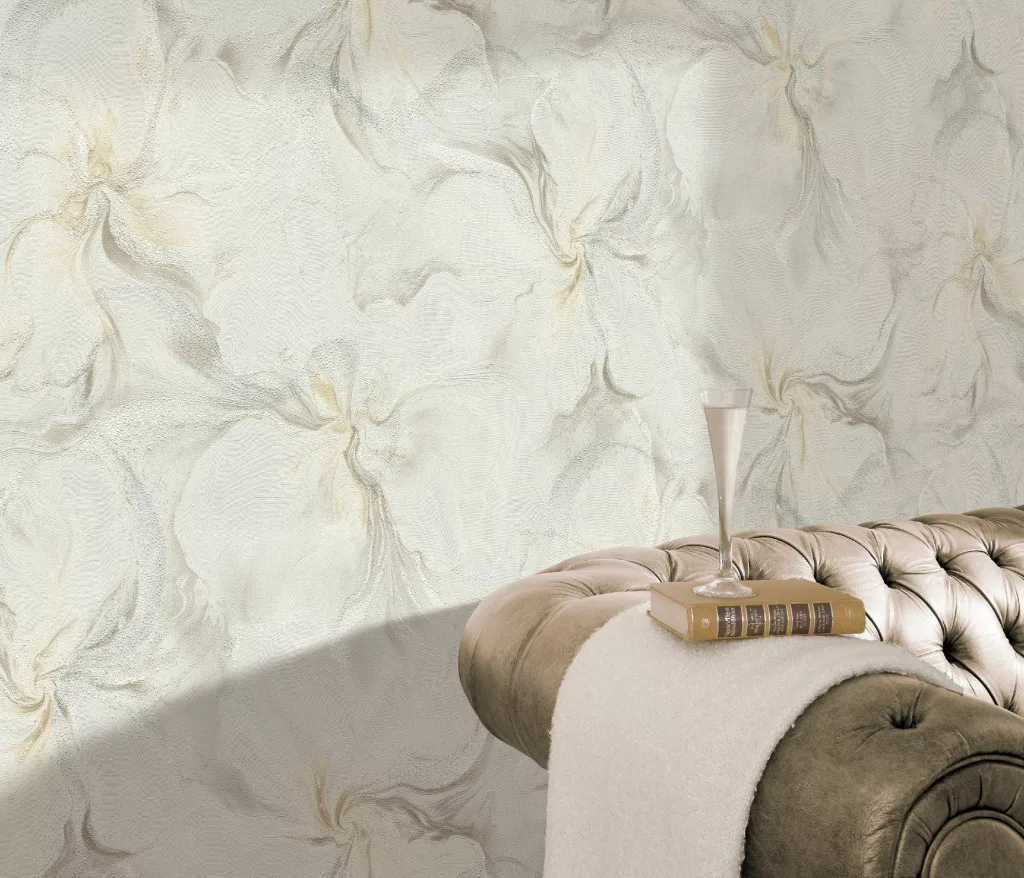 Bézs-fehér-barnás virág mintás csillámos elegáns strukturált vlies-vinyl tapéta