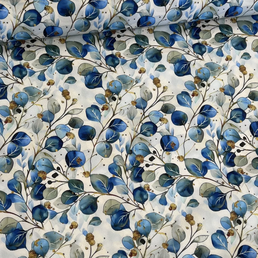 Designer vízálló szövet: Világos alapon kék-arany leveles