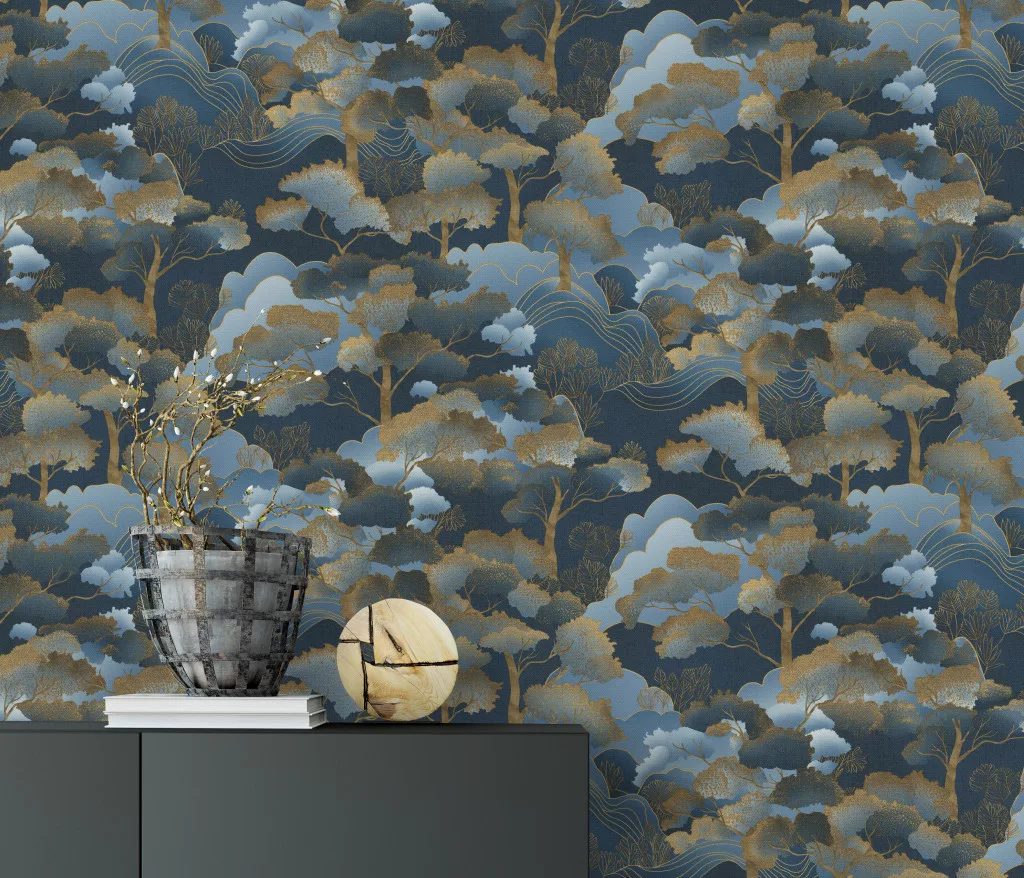 Elle Decoration 4 Sötétkék-arany fa és levél mintás (lángálló, mosható) vlies-vinyl tapéta