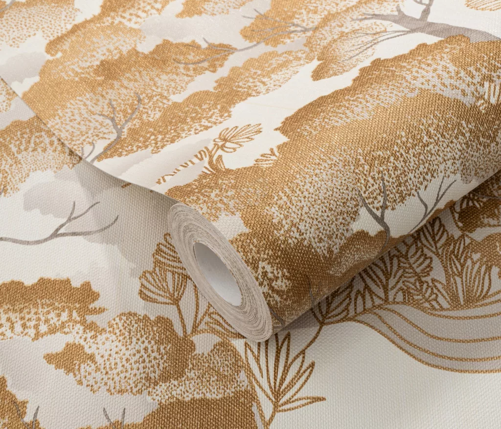 Elle Decoration 4 Törtfehér-arany fa és levél mintás (lángálló, mosható) vlies-vinyl tapéta