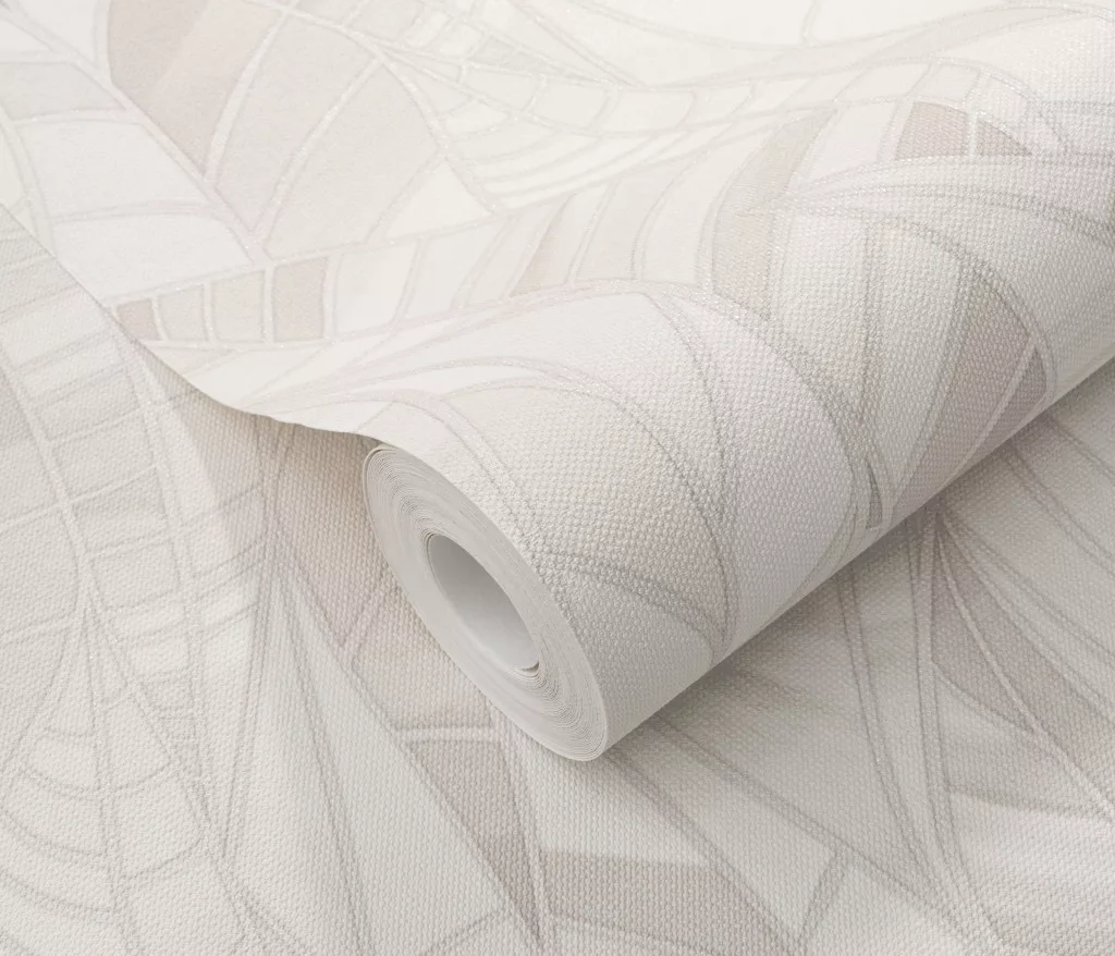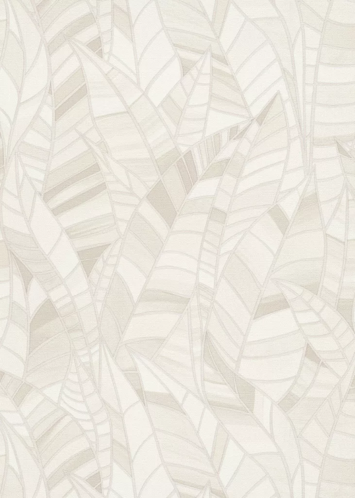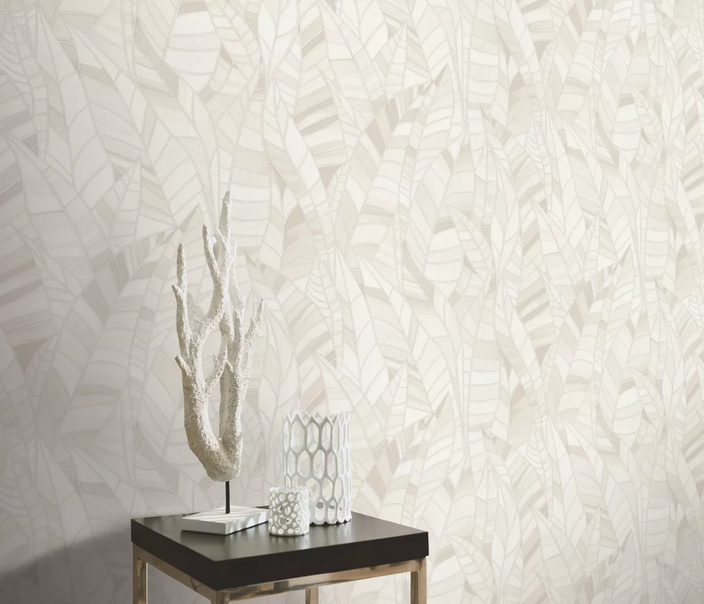 Elle Decoration 4 Törtfehér-gyöngyház levél mintás (lángálló, mosható) vlies-vinyl tapéta