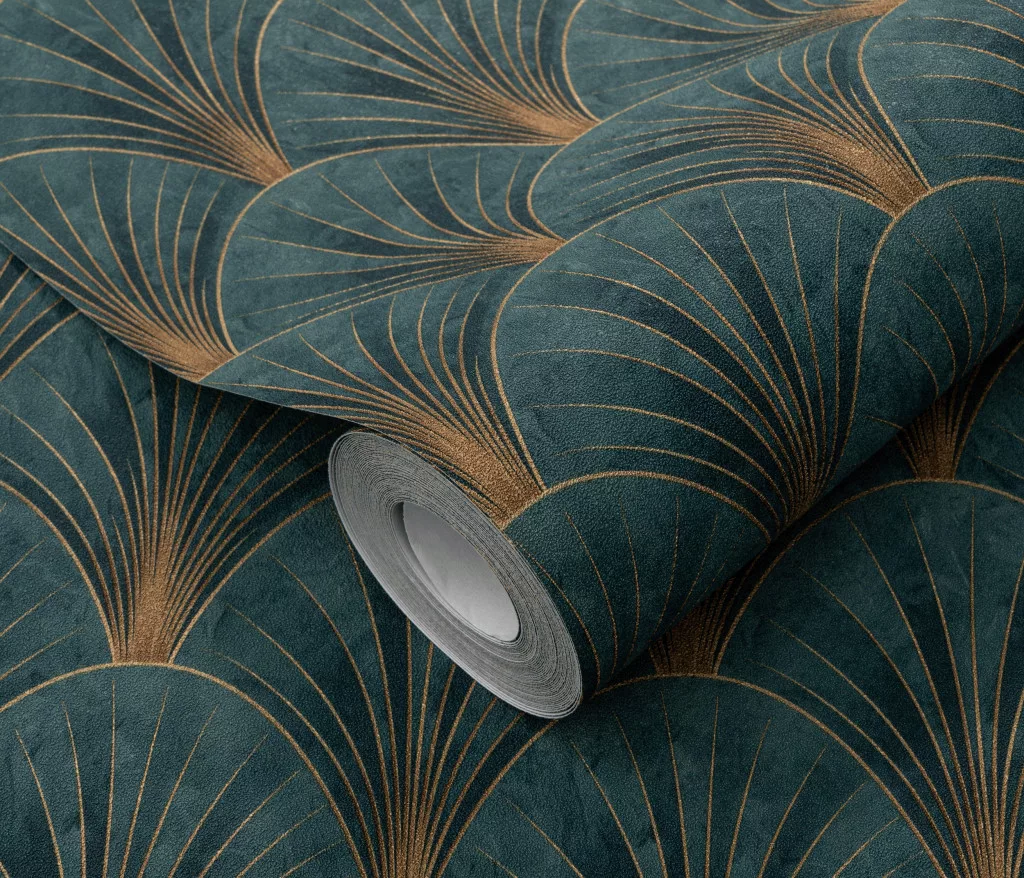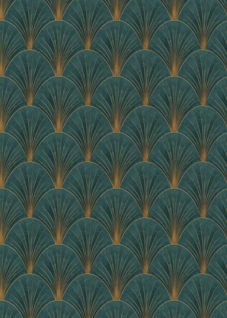 Elle Decoration 4 Türkizzöld-arany art deco mintás (lángálló, mosható) vlies-vinyl tapéta