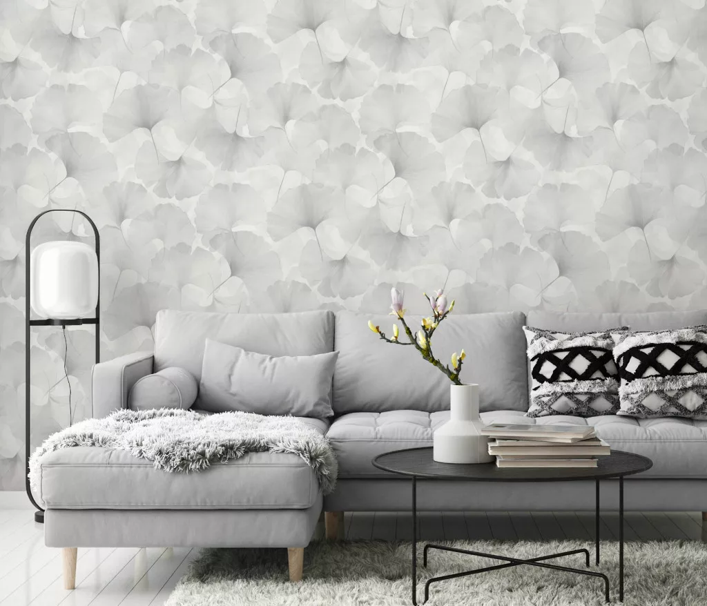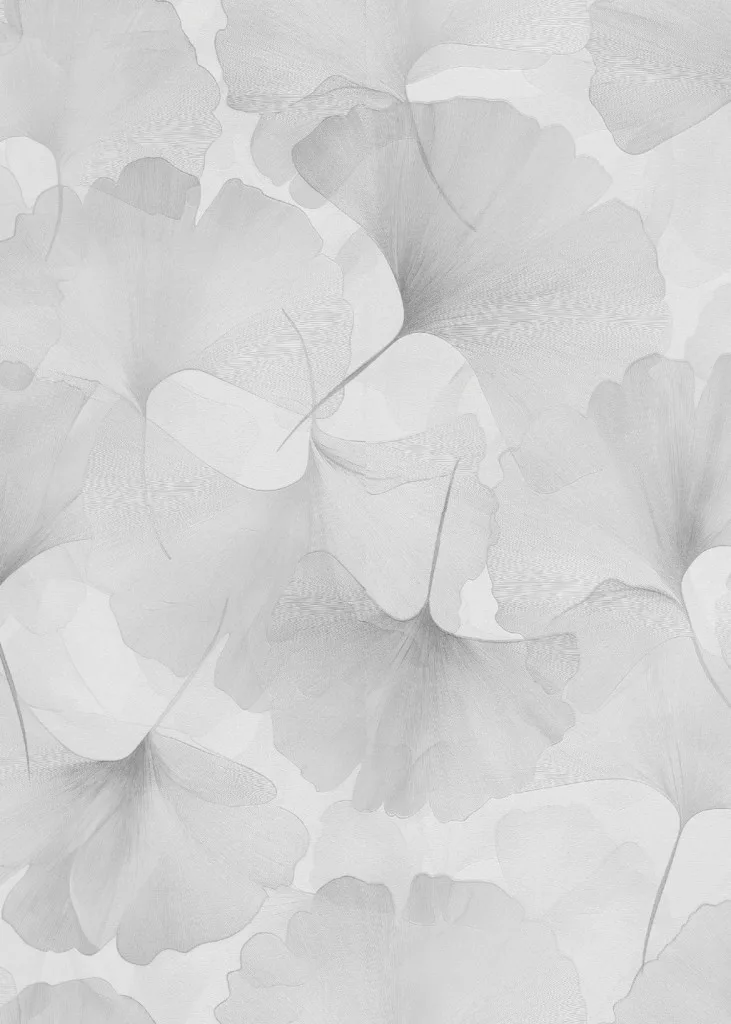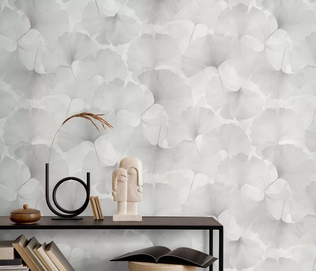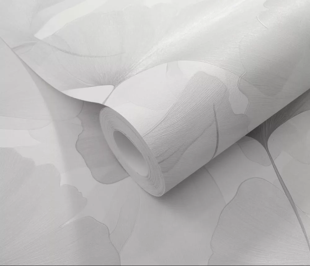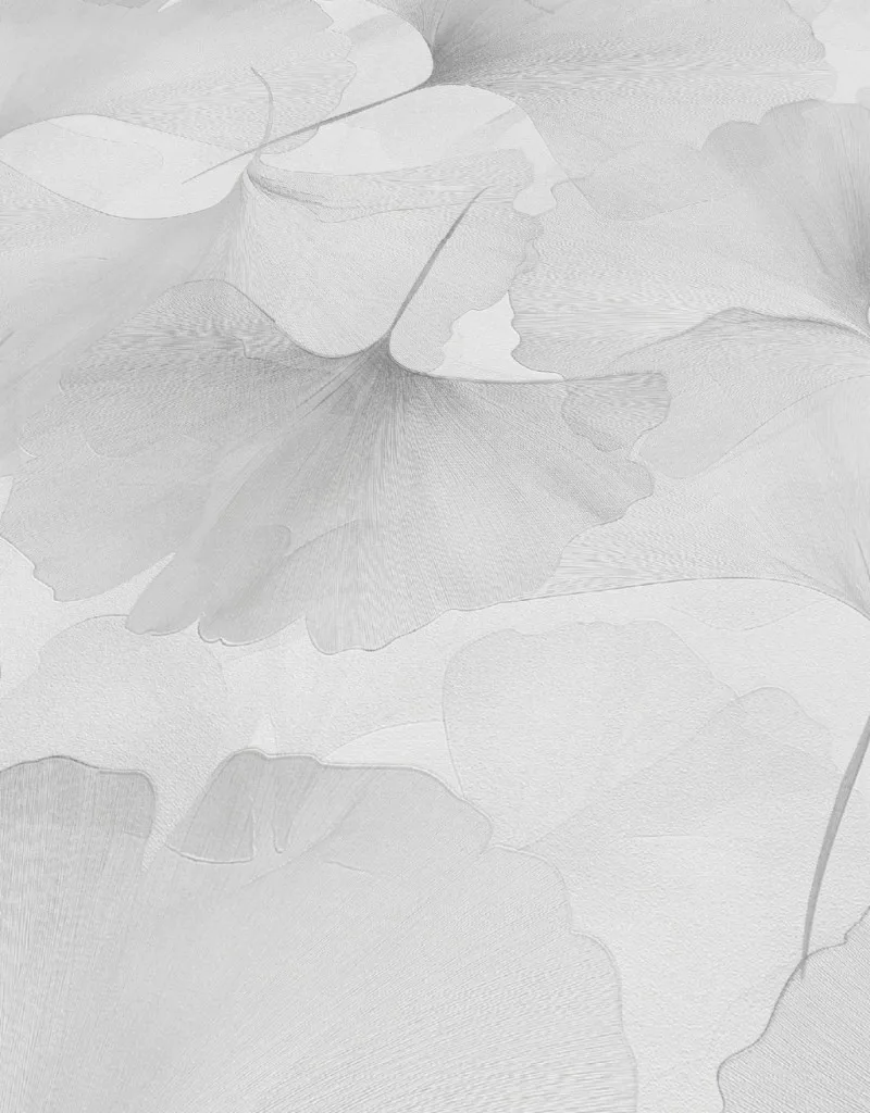 Elysium fehér alapon halványszürke szaténfényű Ginkgo Biloba (lángálló, mosható) vlies-vinyl tapéta