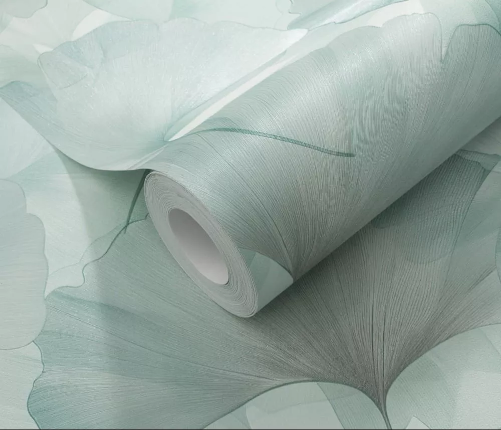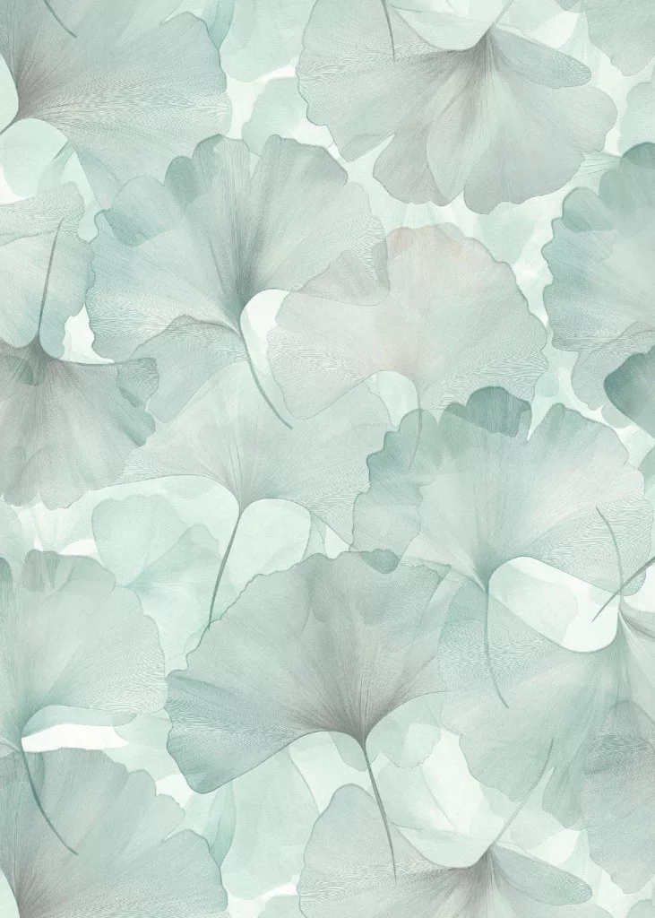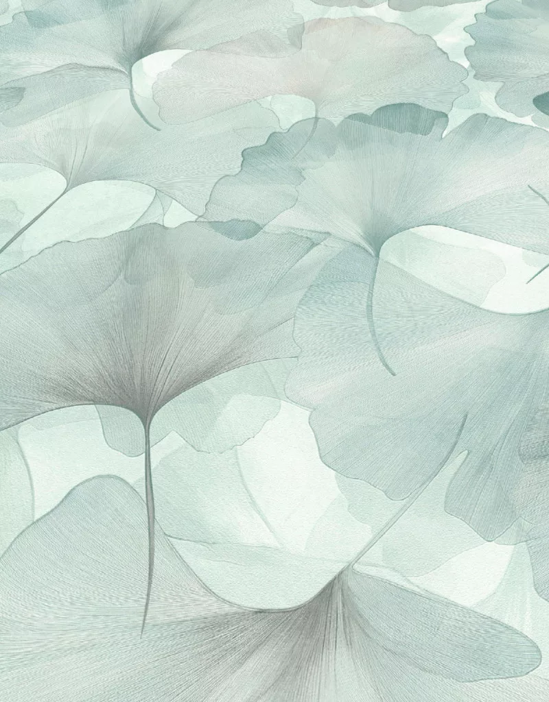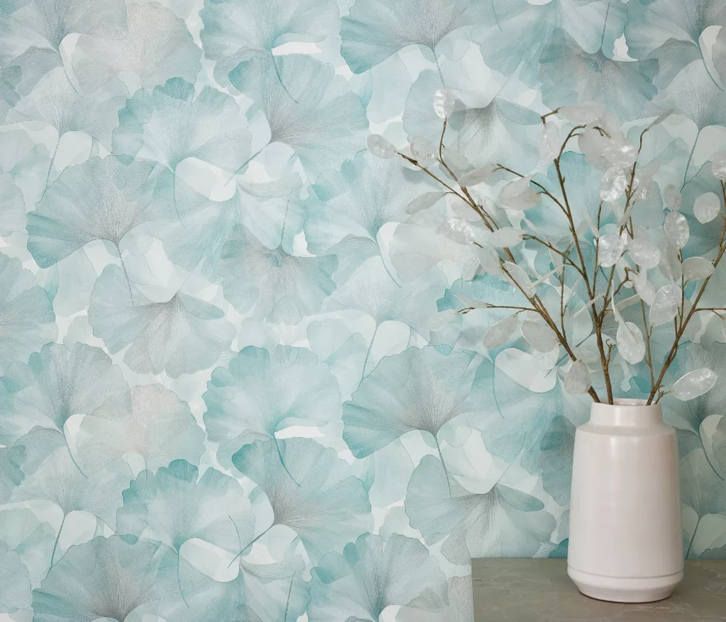 Elysium halványkékes szaténfényű Ginkgo Biloba (lángálló, mosható) vlies-vinyl tapéta