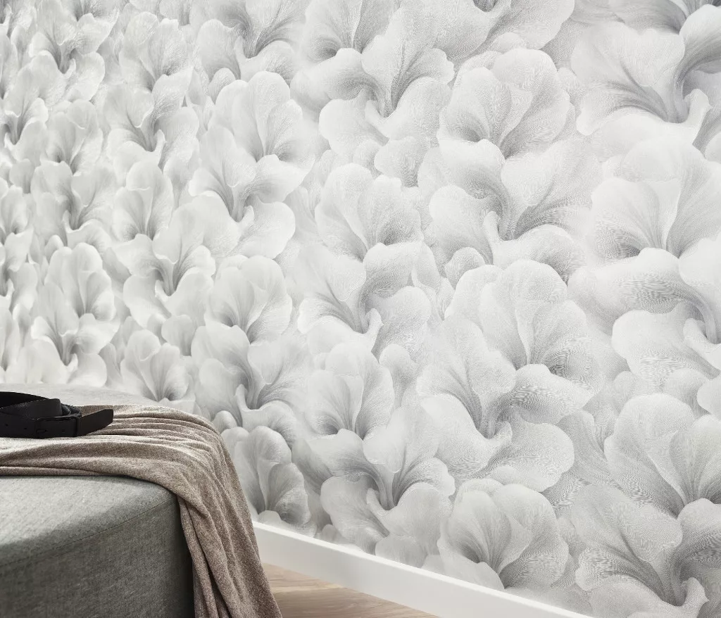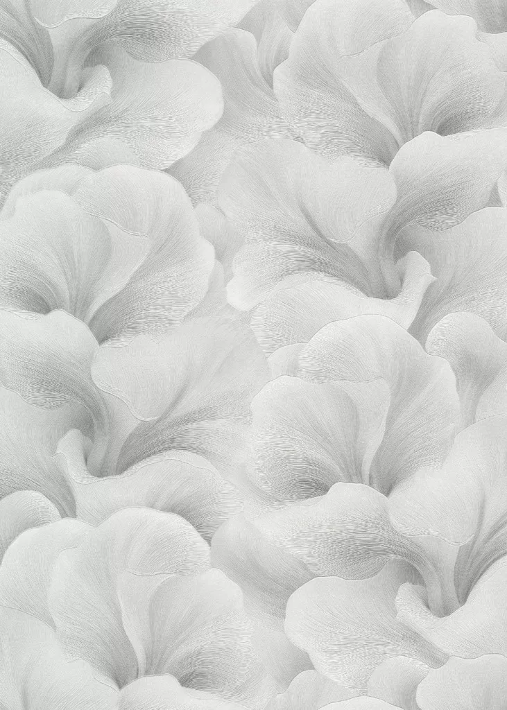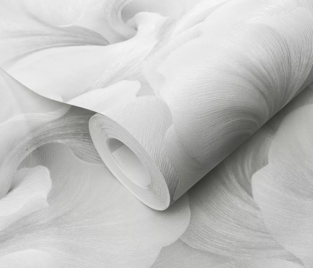 Ezüst-szürke-krém csillogó metálos Ginkgo mintás (lángálló, mosható) vlies-vinyl tapéta