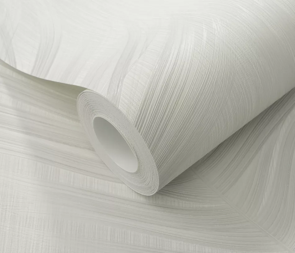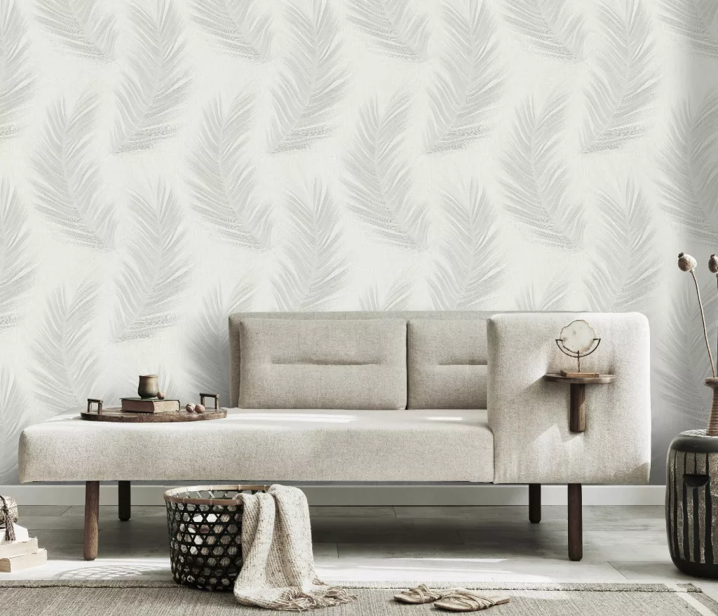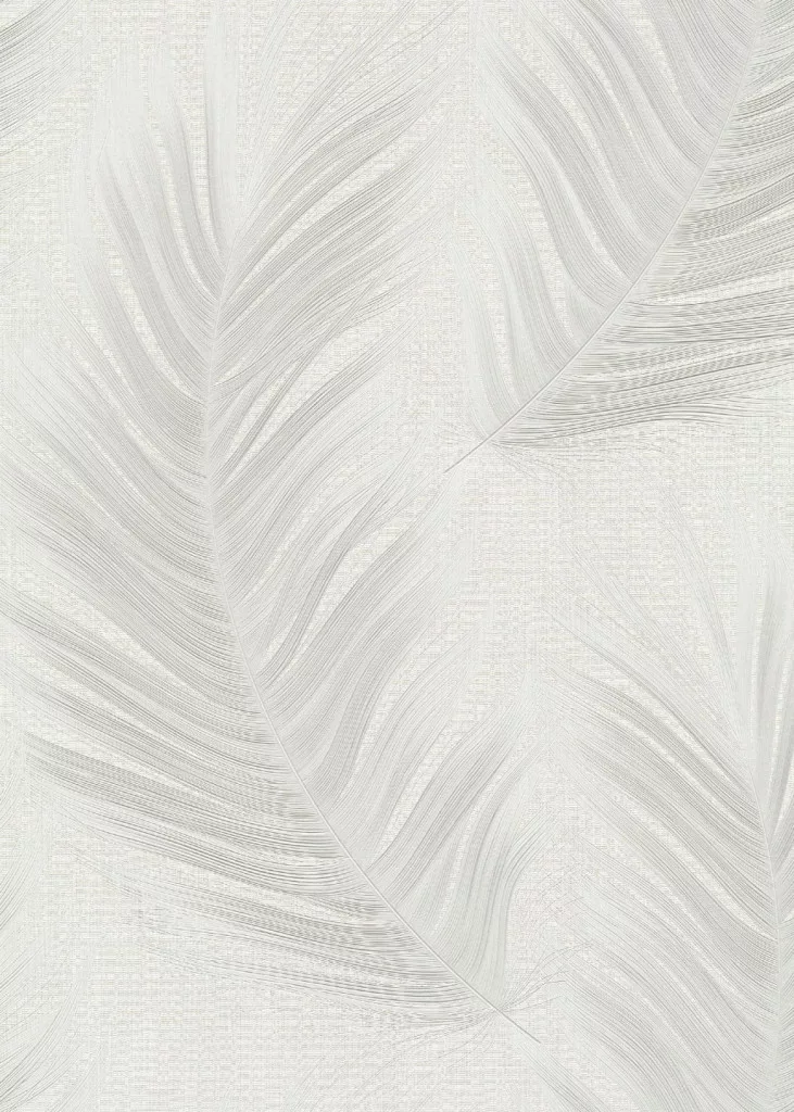 Fehér alapon szürke tollas csillámos elegáns strukturált vlies-vinyl tapéta