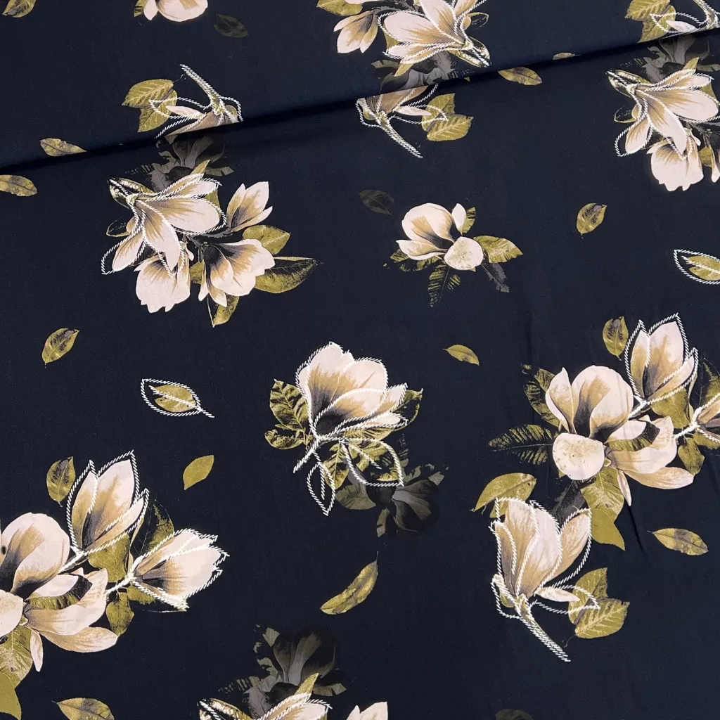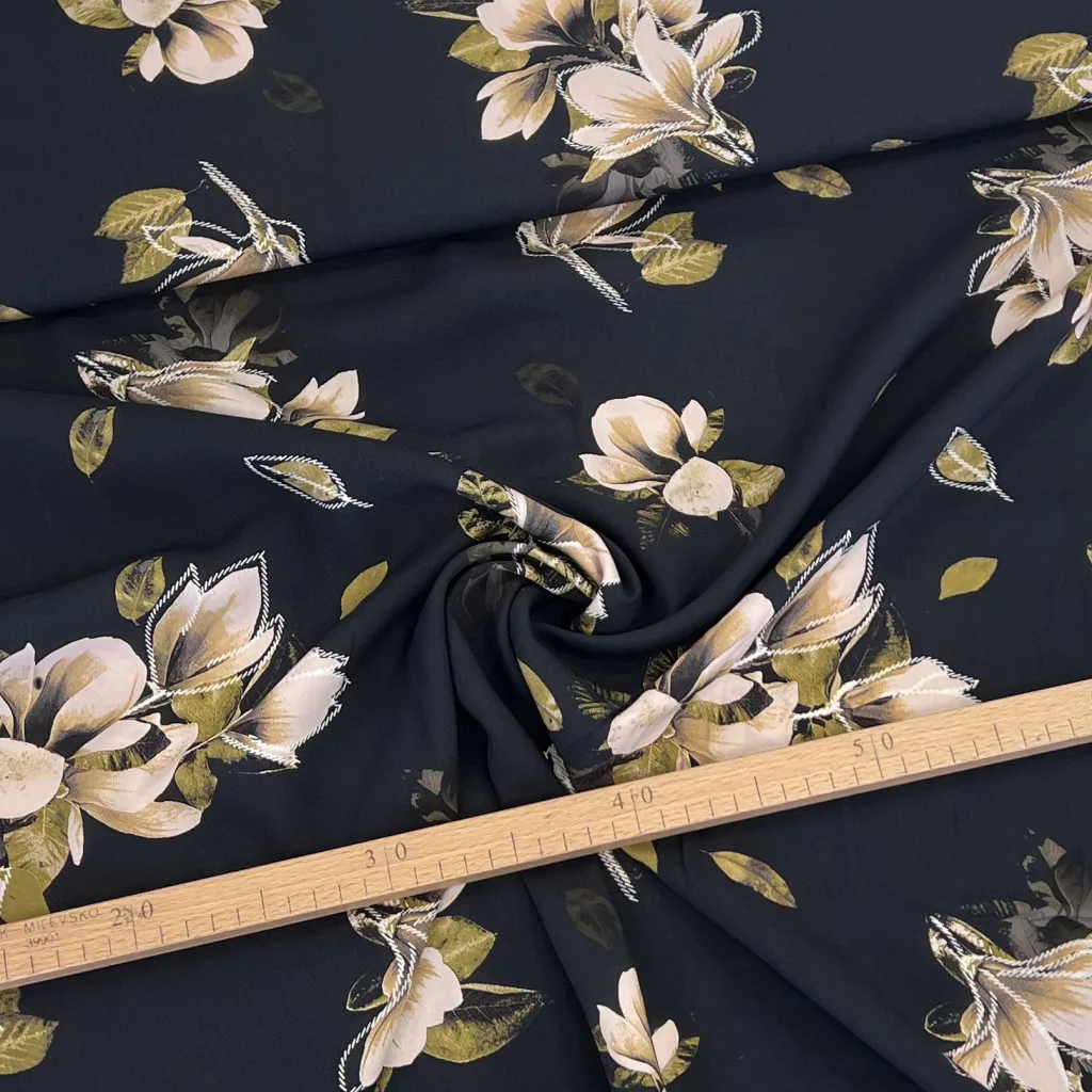 Fekete alapon magnólia levelekkel viszkóz voile