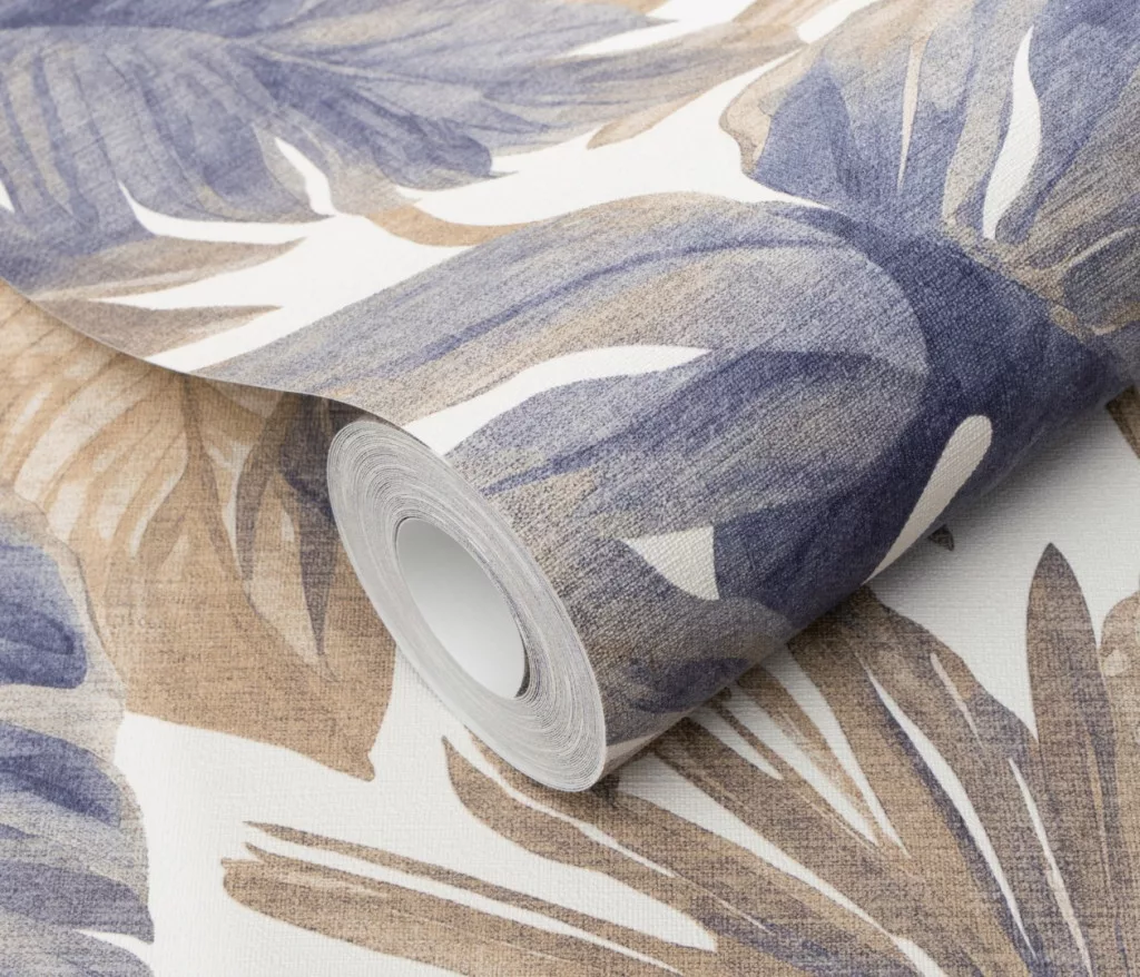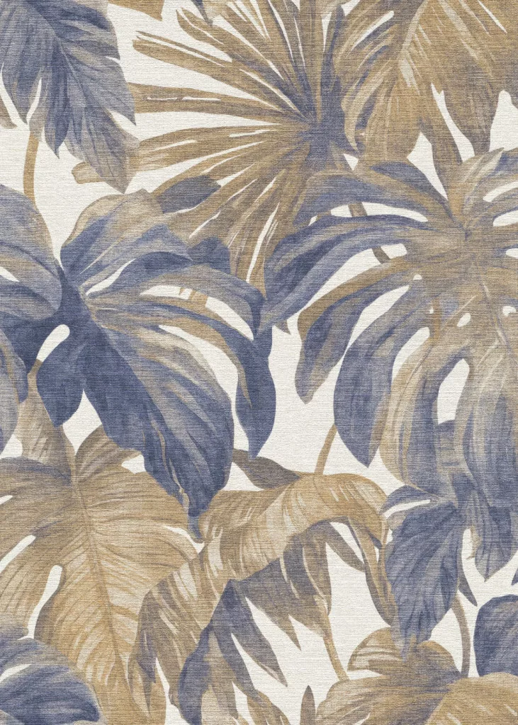Forest Dreams: Mustárosbarna-kék pálmalevél mintás (lángálló, mosható) vlies-vinyl tapéta