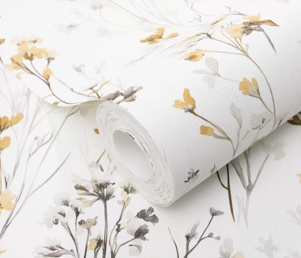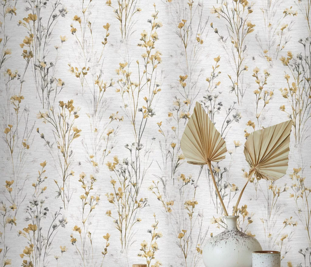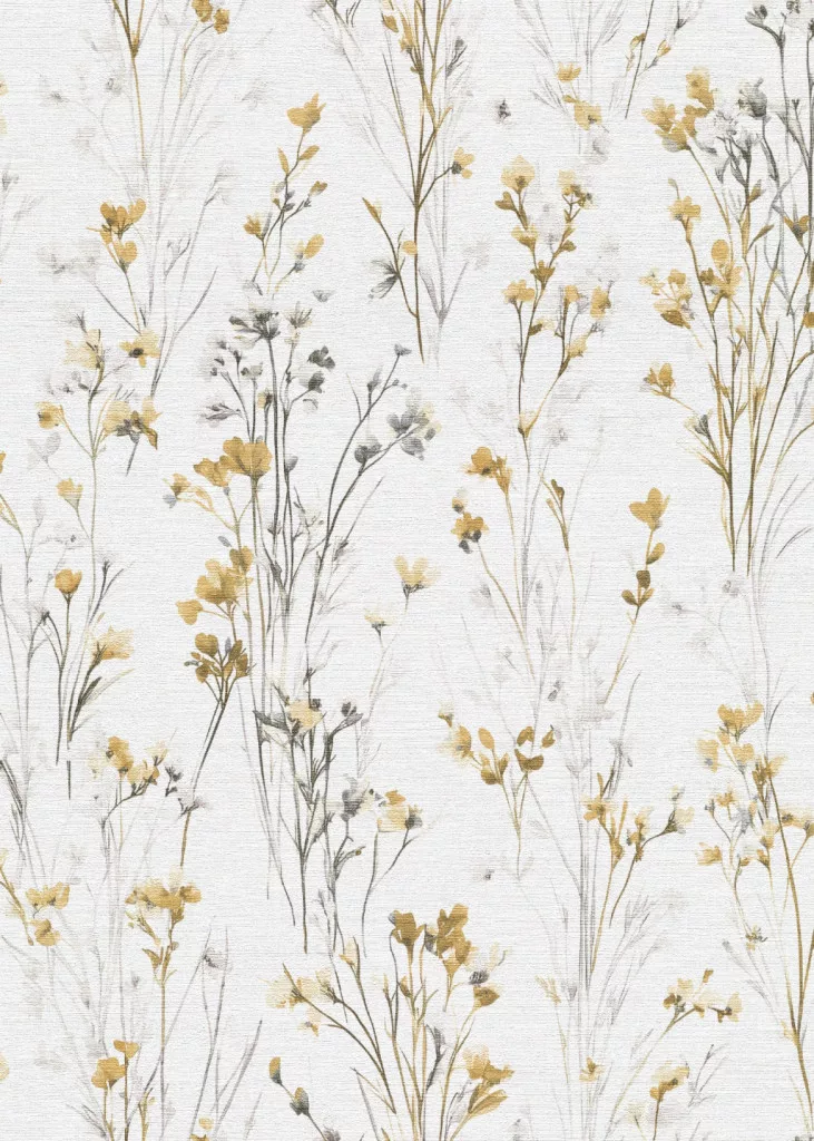 Forest Dreams: Sárga-szürke vadvirágos mintás texturált (lángálló, mosható) vlies-vinyl tapéta