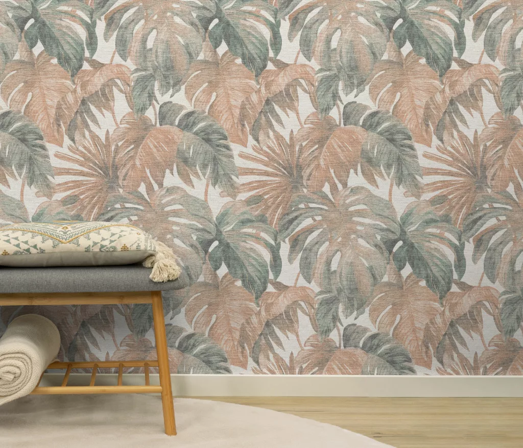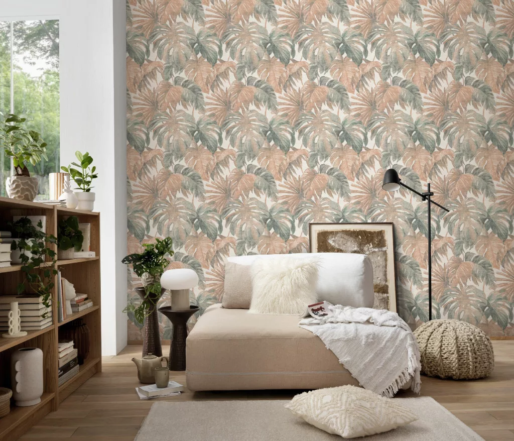 Forest Dreams: Zöld és rézbarna pálmalevél mintás (lángálló, mosható) vlies-vinyl tapéta