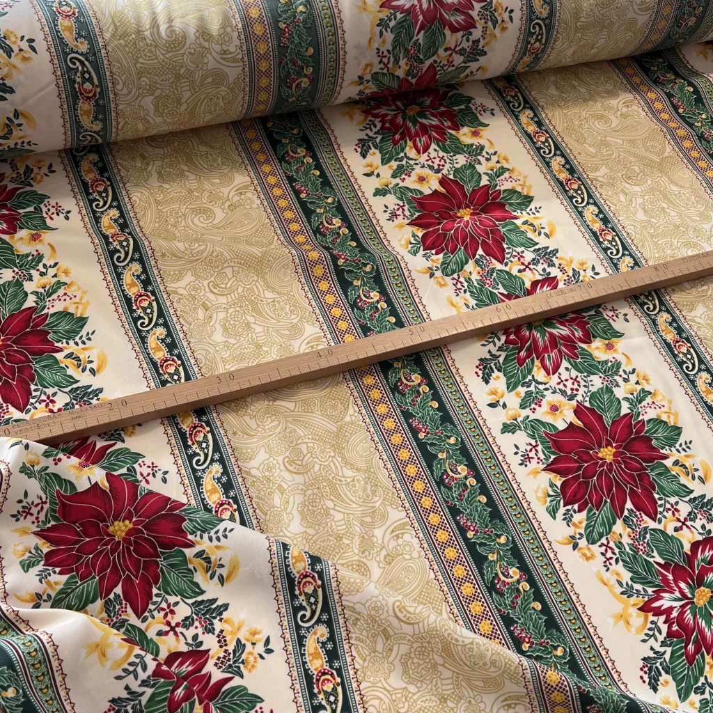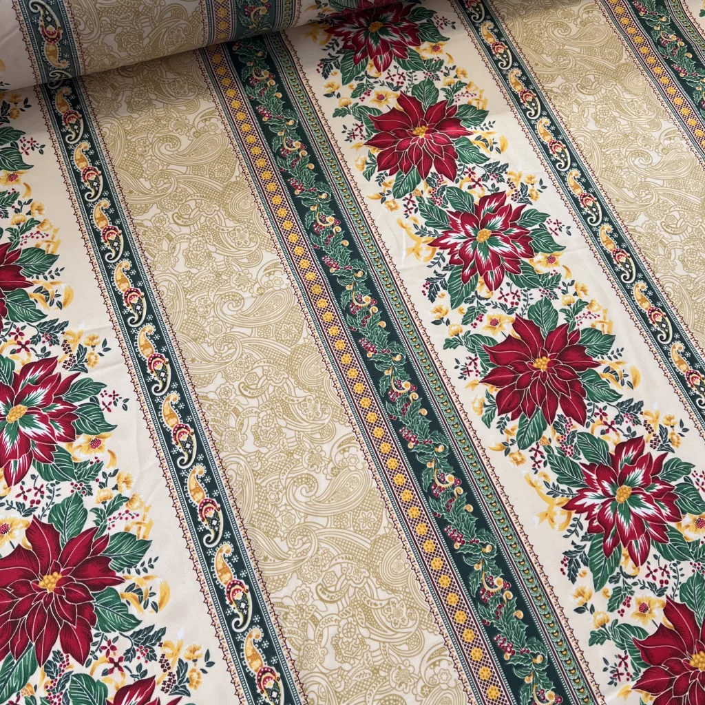 Karácsonyi panama szövet: BÉZSES INDÁS sávos, mikulásvirág füzéres No.3.