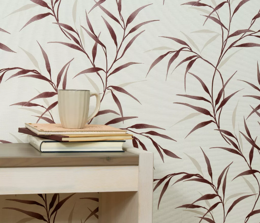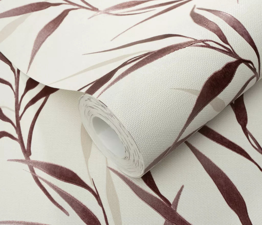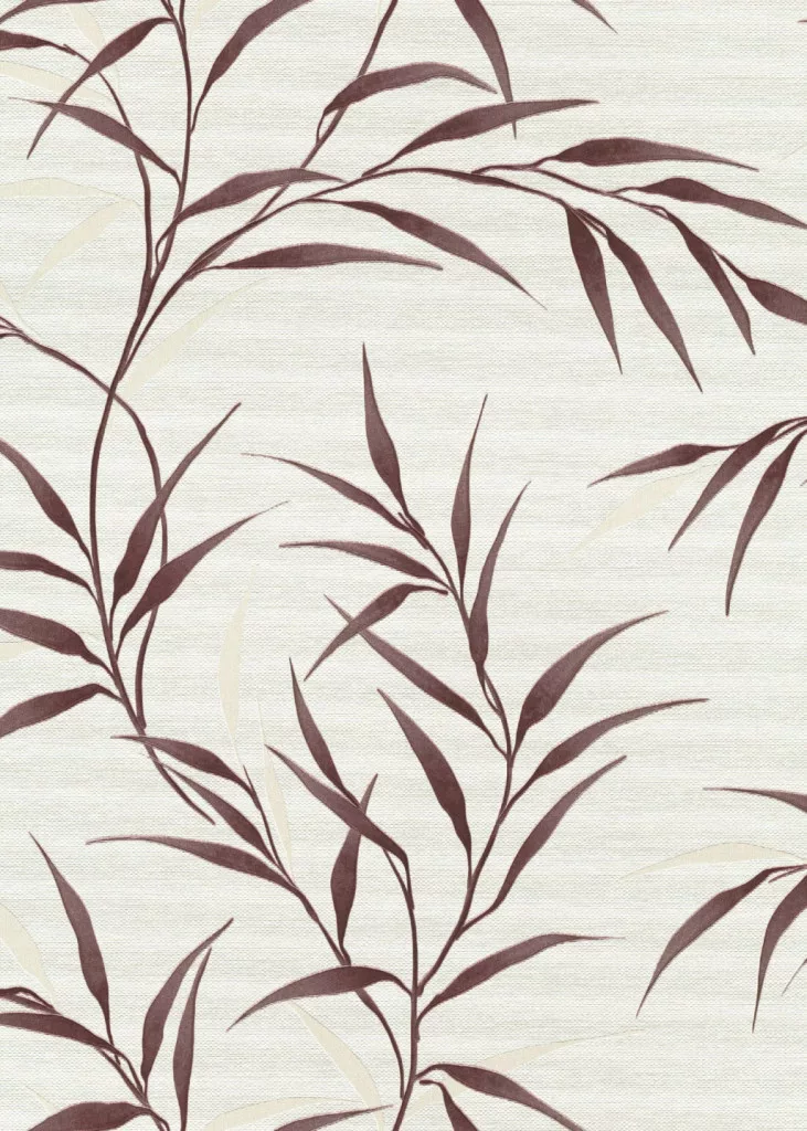 Krém alapon bordó bambusz levél mintás (lángálló, mosható) vlies-vinyl tapéta