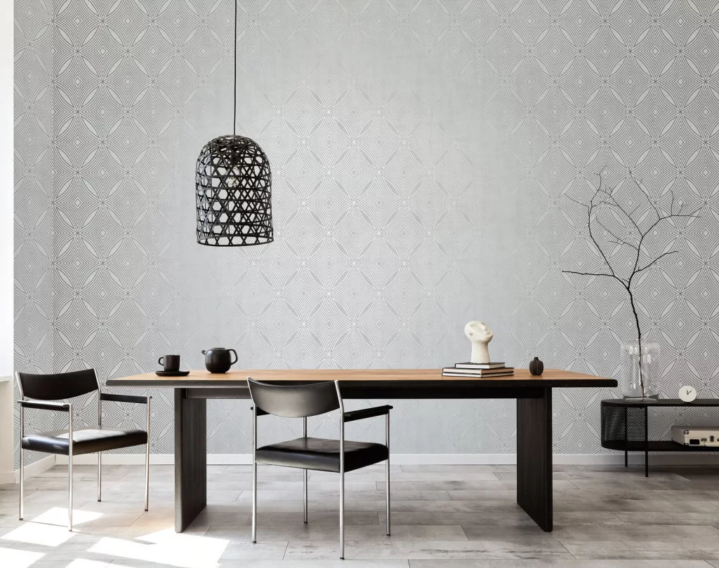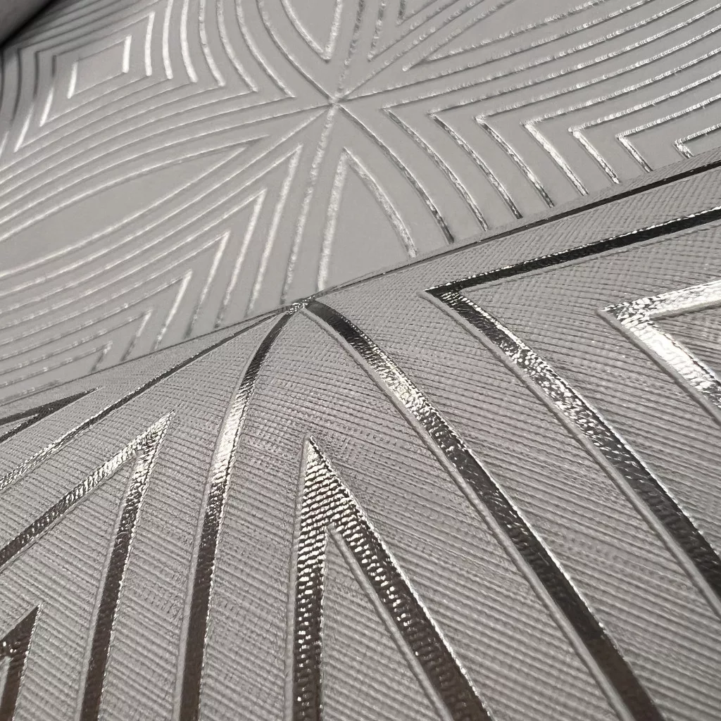 Metálos kollekció Speciel FX2: Gyöngyszürke geometrikus sugárjáték mintás (mosható) vlies-vinyl tapéta