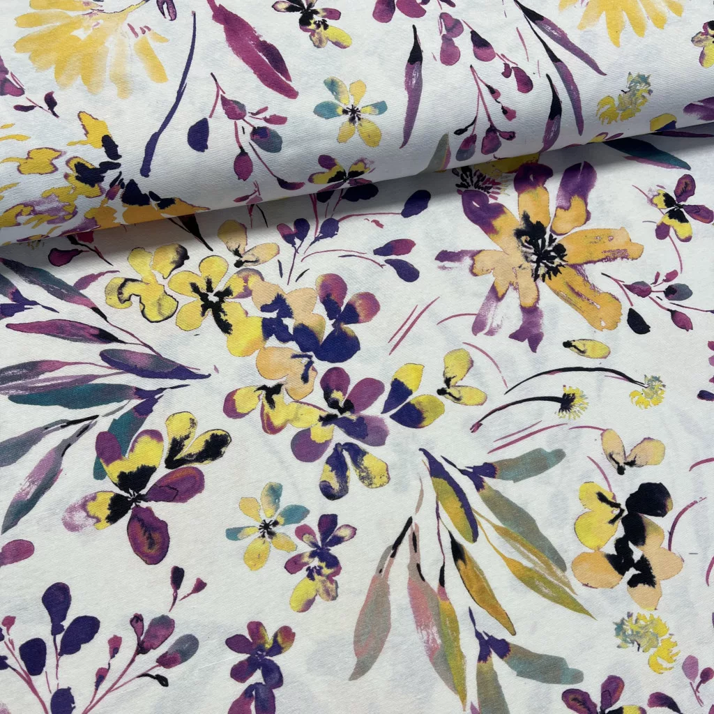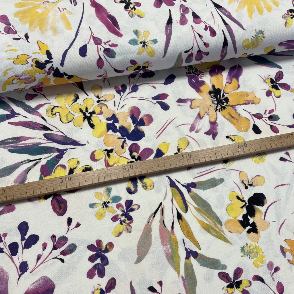 Nyári kert: lila-sárga virágos dekortextil (digitálisan nyomott)