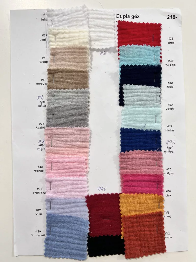 Dupla géz anyagaink 100% pamut összetételűek (140 cm szélesek). Az anyag nagyon puha és bőrbarát, hasonló a tapintása, mint a tetra pelenkának, csak ez még tömörebb és puhább. Vasalást nem igényel, mert alapból kicsit gyűrőttes hatása van. Mosás után könnyen szárad. Mosását max. 30-40 fokon ajánljuk, hogy ne menjen össze annyira. Akár 90 fokot is bír gond nélkül, ha nyálkendőnek használjuk, de ebben az esetben 10-15% zsugorodással kell számolni.