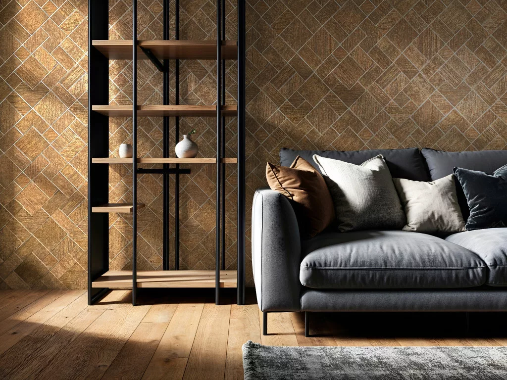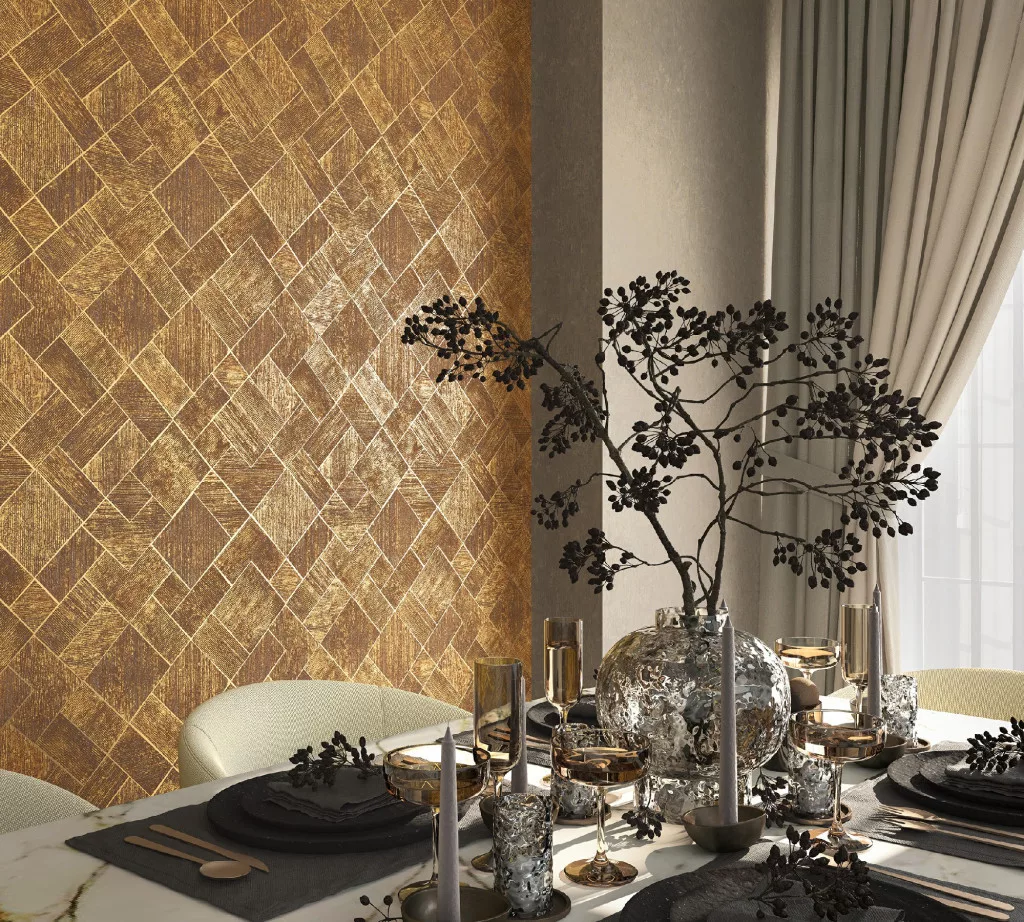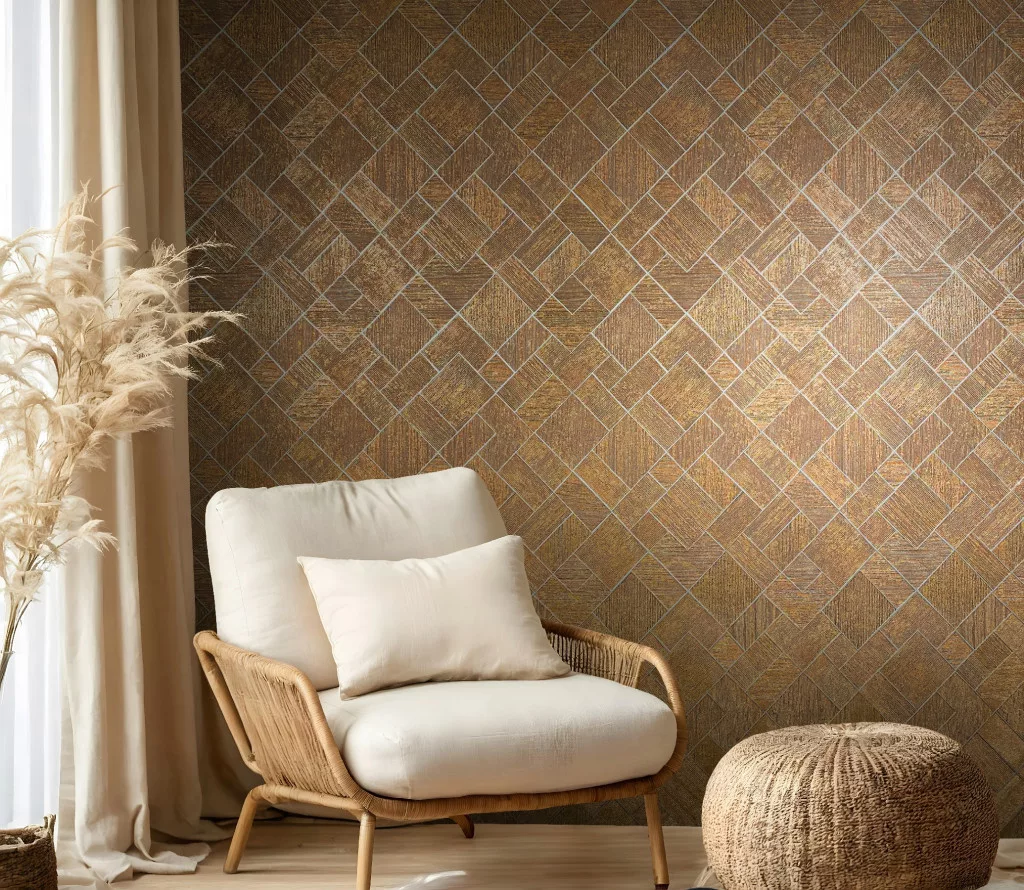 Ritus: Óarany arany pici barnával gyöngyházas fényes hatású négyszöges modern dombormintás (mosható) vlies-vinyl tapéta