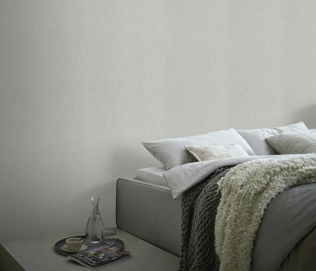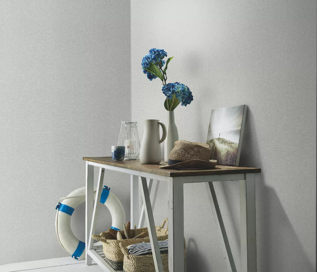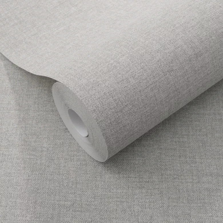 Secret Garden: Egyszínű halvány szürke lenes hatású textúrájú (lángálló, mosható) vlies-vinyl tapéta
