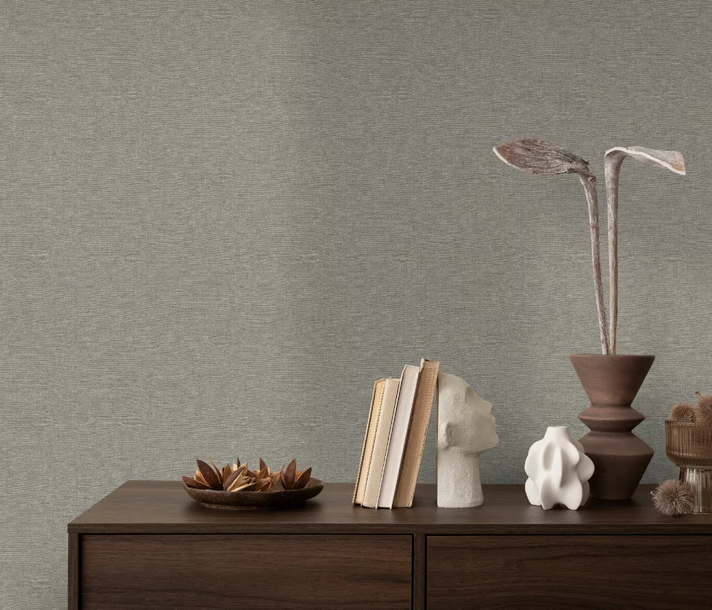 Secret Garden: Egyszínű közép szürke csipetnyi barnával lenes hatású textúrájú (lángálló, mosható) vlies-vinyl tapéta