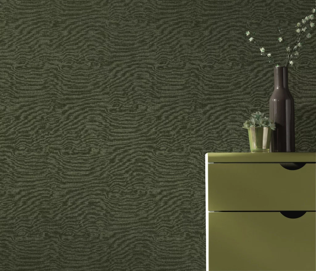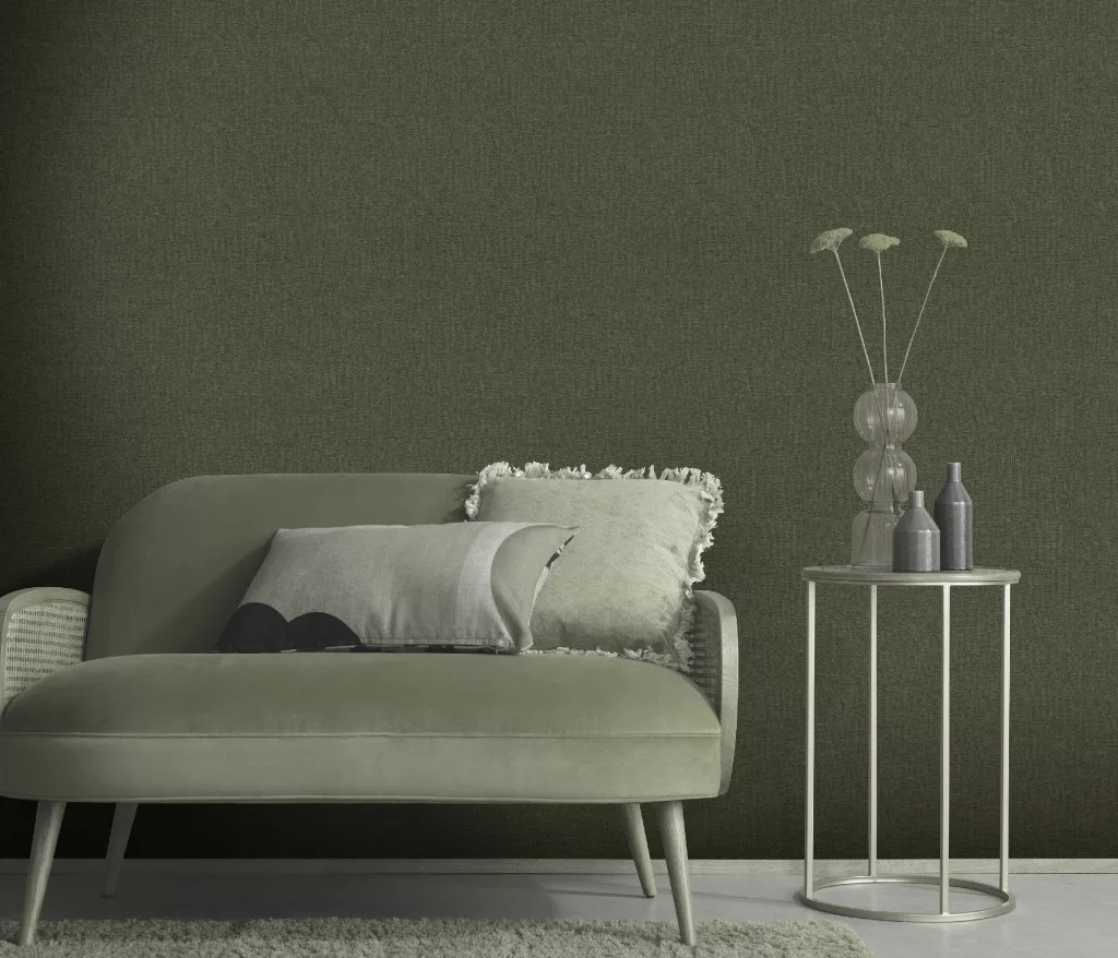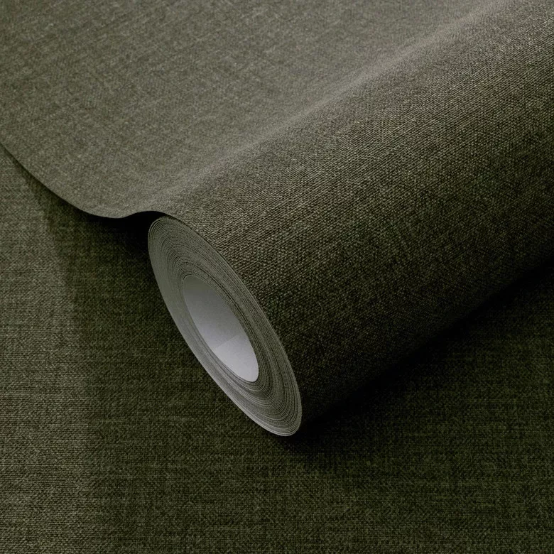 Secret Garden: Egyszínű sötétzöld lenes hatású textúrájú (lángálló, mosható) vlies-vinyl tapéta