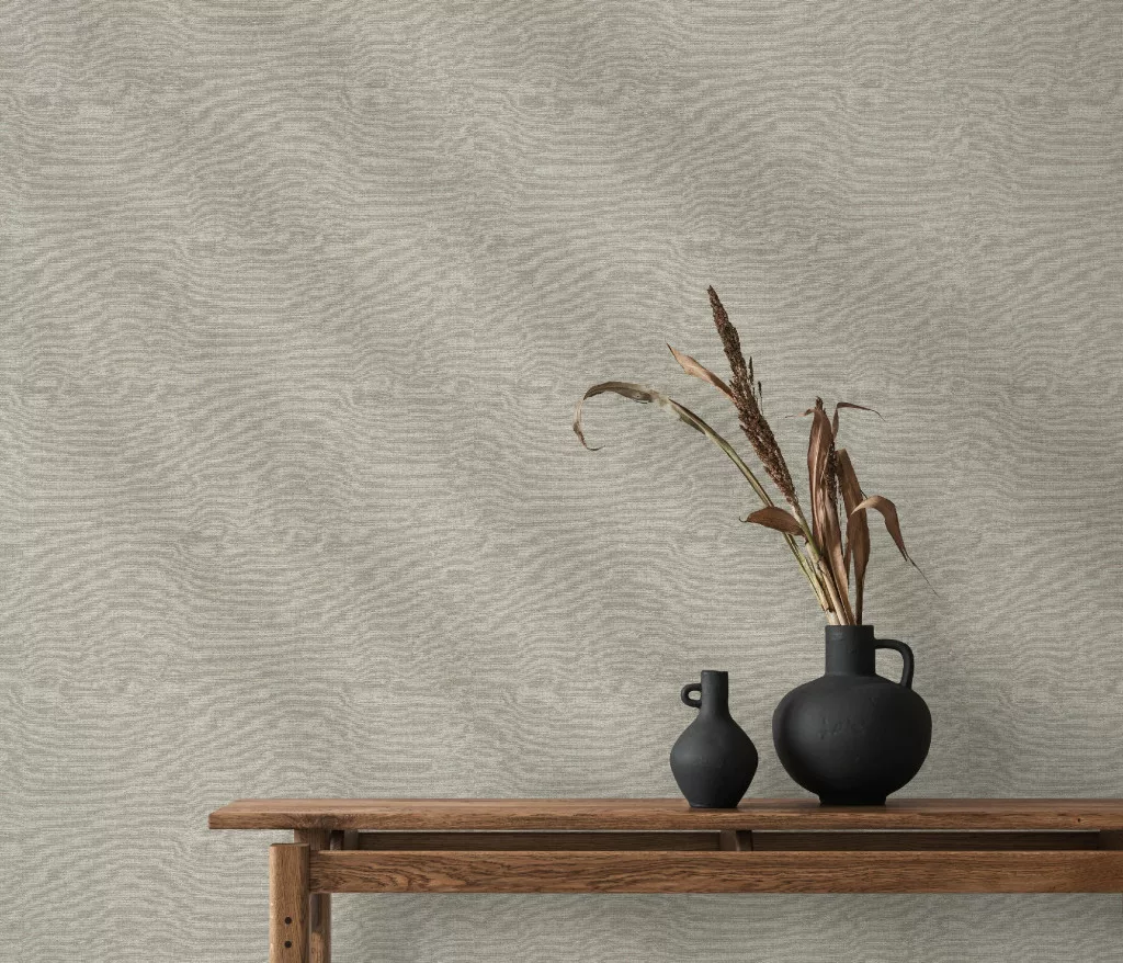 Secret Garden: Egyszínű szürke csipetnyi barnával lenes hatású textúrájú (lángálló, mosható) vlies-vinyl tapéta