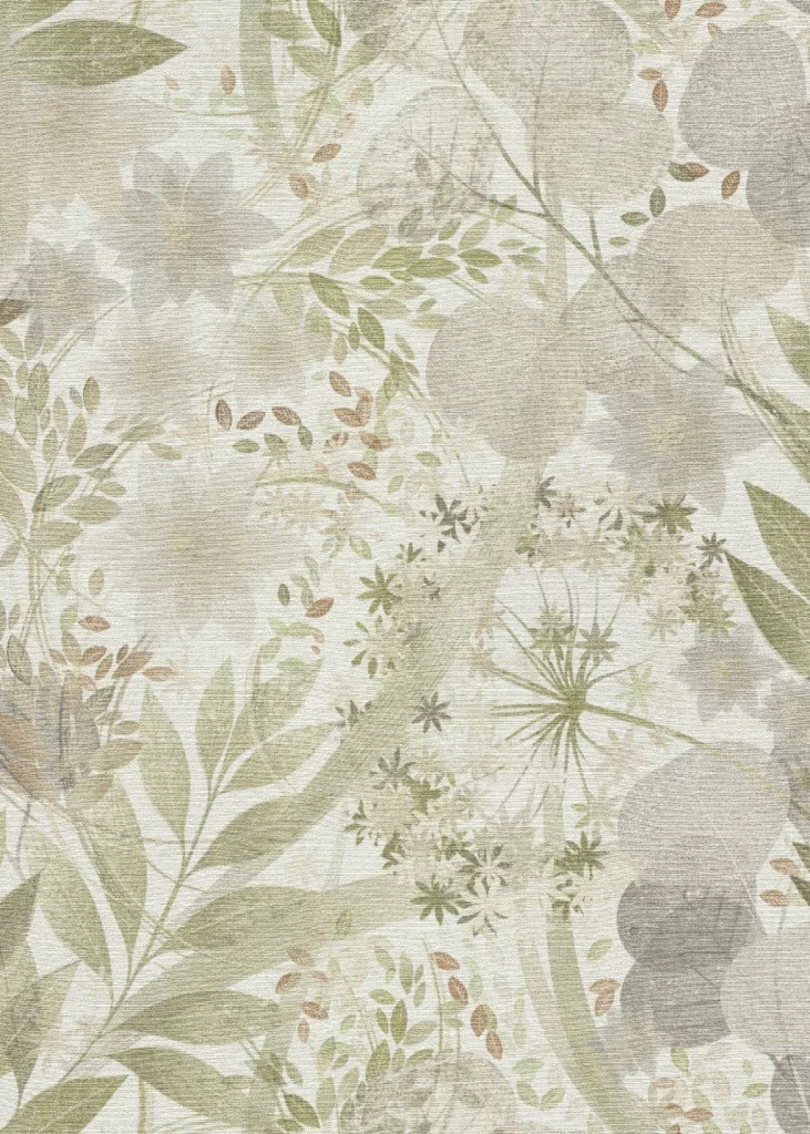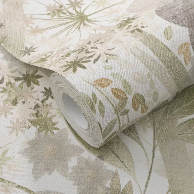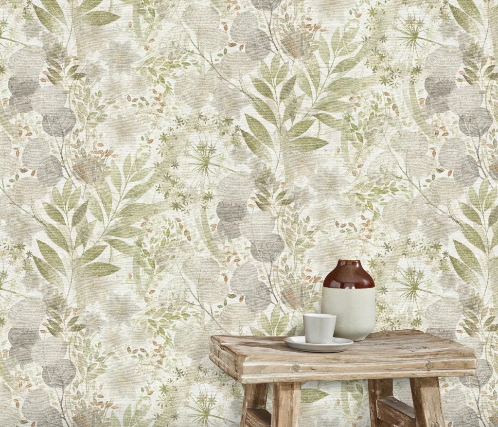 Secret Garden: Fehér alapon zöld-szürle, kis bézses virágok levelekkel (lángálló, mosható) vlies-vinyl tapéta