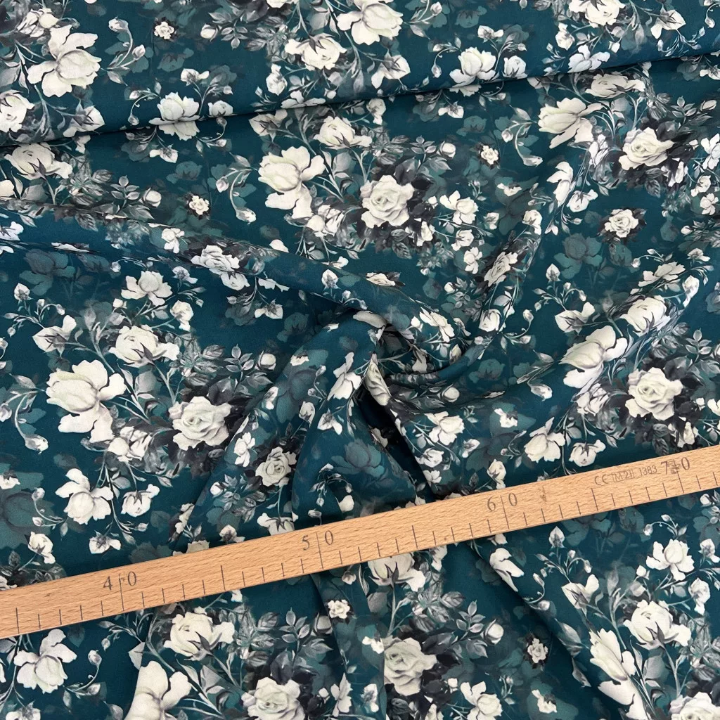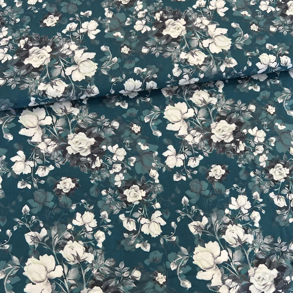 Sötét türkiz alapon fehér rózsás viszkóz voile