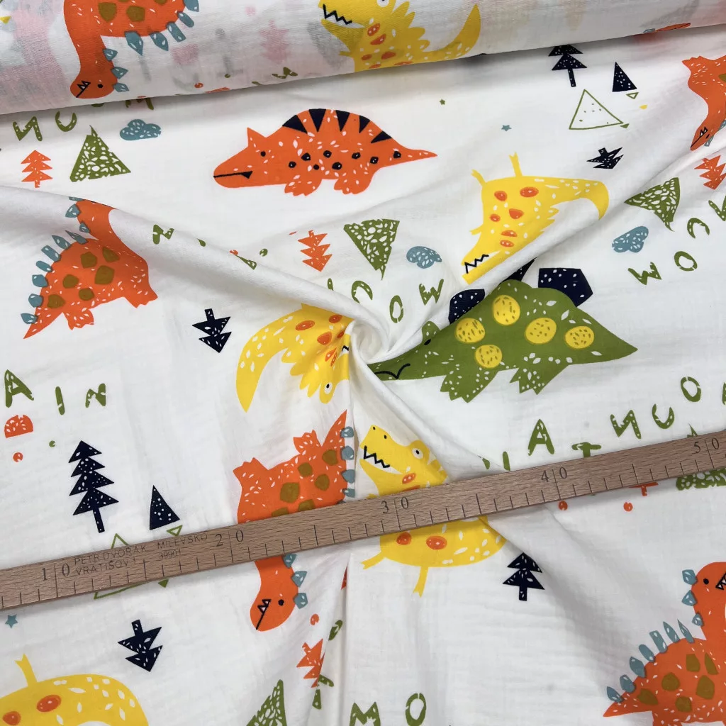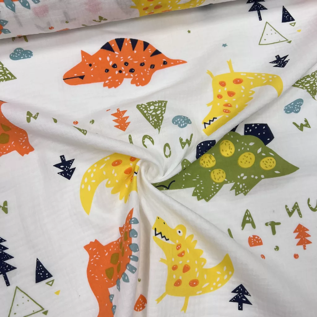 Dupla géz anyagaink 100% pamut összetételűek (140 cm szélesek). Az anyag nagyon puha és bőrbarát, hasonló a tapintása, mint a tetra pelenkának, csak ez még tömörebb és puhább. Vasalást nem igényel, mert alapból kicsit gyűrőttes hatása van. Mosás után könnyen szárad. Mosását max. 30-40 fokon ajánljuk, hogy ne menjen össze annyira. Akár 90 fokot is bír gond nélkül, ha nyálkendőnek használjuk, de ebben az esetben 10-15% zsugorodással kell számolni.