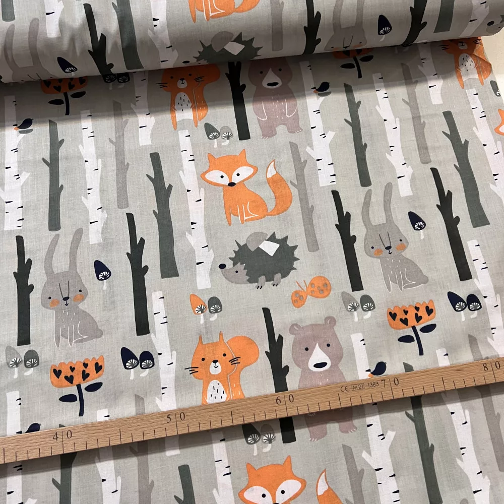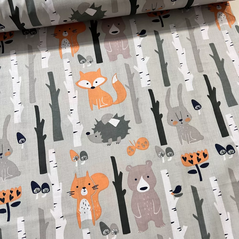 Szürkés-zöld alapon erdei állatok (maci, róka, nyuszi) 160 cm sz. pamutvászon (KA)