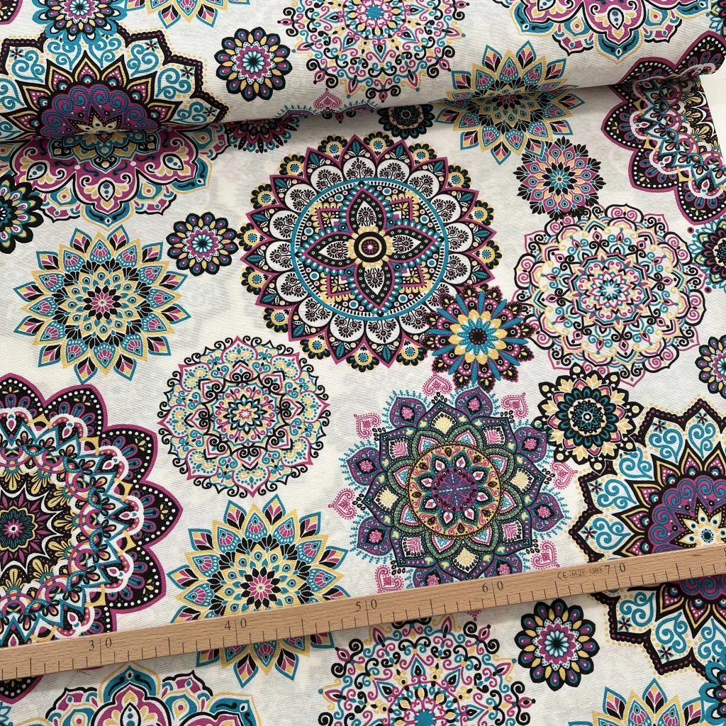 Világos alapon ciklámen-sárga-kék mandalás dekortextil