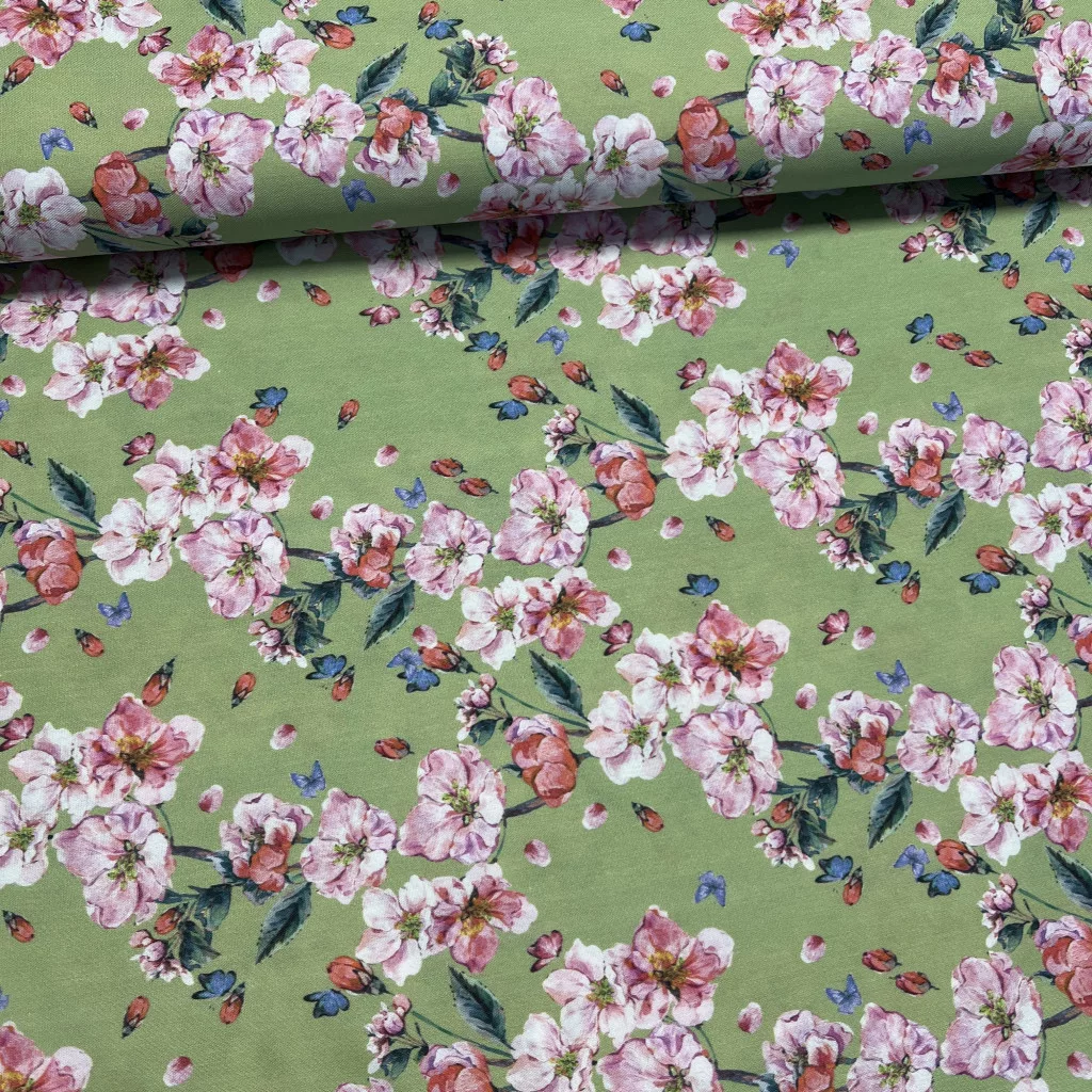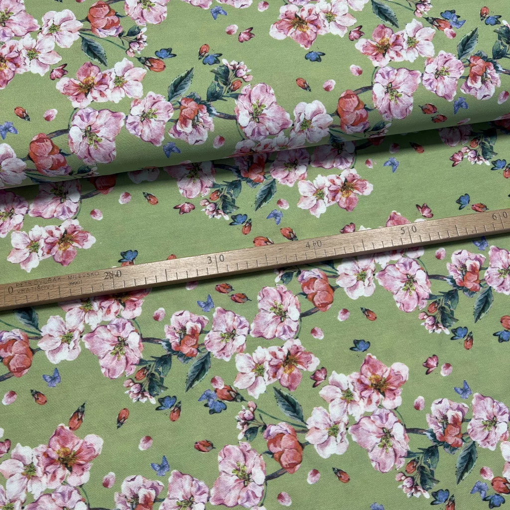 Zöld alapon rózsaszín cseresznyevirágos dekortextil (A)